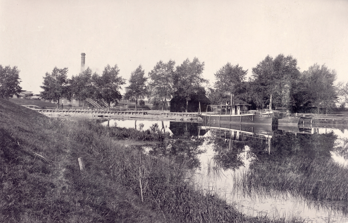 Motiv från Linköpings hamnområde 1892. Vid kaj ses bogserångfartyget Tekla, byggd i Stockholm 1889 för trafik på Kinda kanal. Fartyget tillhörde P. Wikström i Stockholm som även ägde Linköpings ångsåg vars anläggningar skymtar mellan träden i bakgrunden.