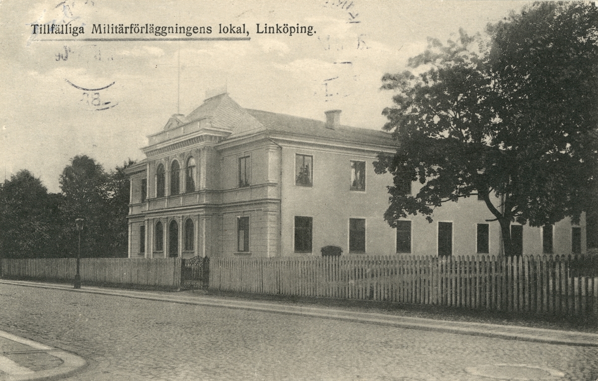 Ett år 1920 postgånget brevkort med vy mot en av flera tillfälliga militärförläggningar som uppstod i Linköping under 1910-talet. Skälet till att värnpliktiga fick förläggas inne staden var de segdragna turerna kring var de planerade anläggningarna för Första och Andra livgrenadjärregementena skulle placeras, vilket gav förseningar som följd. Det avbildade huset hade ursprungligen uppförts i början av 1880-talet som teater- och cirkusbyggnad i den så kallade Wernerska trädgården, som under 1800-talets senare hälft utgjort platsen för ett av stadens största nöjesetablissemang. Vid tiden för bilden var epoken av förströelser emellertid förbi och lokalen fanns tillgänglig för uthyrning.