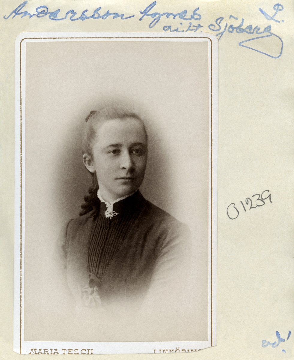 Porträtt av Agnes Sjöberg, född Andersson. Agnes föddes den 23 juli 1872 i Linköping som dotter och enda barnet till bokhållare Frans Adolf Andersson och Amalia Sofia Hübinette. Gift i december månad 1899 med gårdsägare och handlare Fredrik Melker Sjöberg med vilken hon fick sonen Nils Fredrik Åke. Blev änka året 1909 och tog då enligt församlingsböckerna över som handlare och gårdsägarinna efter maken. Hon avled den 8 januari 1965 i Linköping.