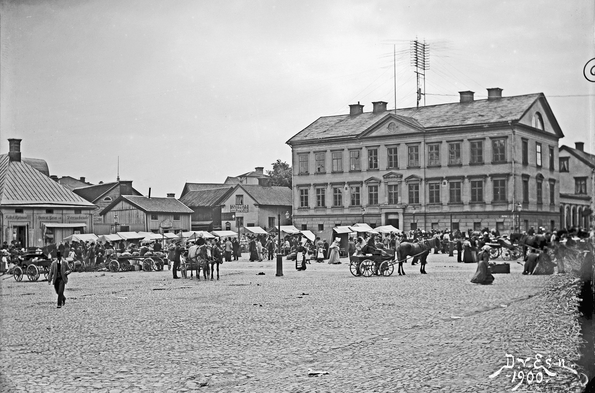 Vy över sydöstra delen av Stora torget i Linköping. I fonden före detta Rådhuset.