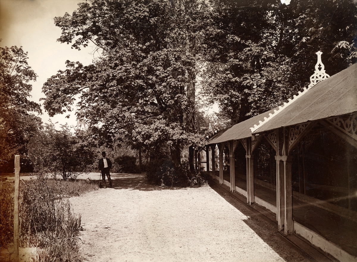 Motiv från Wallenbergska trädgården i Linköping. En sekundär påskrift anger fotoåret 1898 men då var den stora tomten nyligen avstyckad och såld för exploatering, varför korrekt datering torde tidigareläggas något eller några år. Oaktat exakt datering var kägelbanan på bilden vid tiden omkring 30 år, uppförd som den var 1868 av dåvarande gårdsägare Adolf Wallenberg. Grosshandlare Axel Karlsson kom vidare i besittning av banan och lät flytta den till sitt sommarnöje Drabbisdal i Berg norr om Linköping. Sedan 1964 är samma kägelban placerad i friluftsmuseet Gamla Linköping.