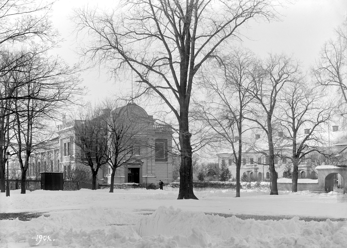 Linköpingsvy som inte nämnvärt förändrats sedan fotograf Didrik von Essen frös den vintern 1902. I blickfånget låg då som nu läroverkets unika gymnastikhus, uppfört 1880-81 efter ritningar av linköpingsingenjören Rudolf Ström med viss bearbetning av den från Stockholm verksamme arkitekten Axel Fredrik Nyström. Resultatet blev en stolt byggnad i en slags tegelrenässans med höga fönster och rik putsdekor. Över portalen ses ett medaljongporträtt av den svenska gymnastikens fader, Pehr Henrik Ling. Till höger skymtar Konsistoriehuset som även det ännu står kvar i oförändrat skick.