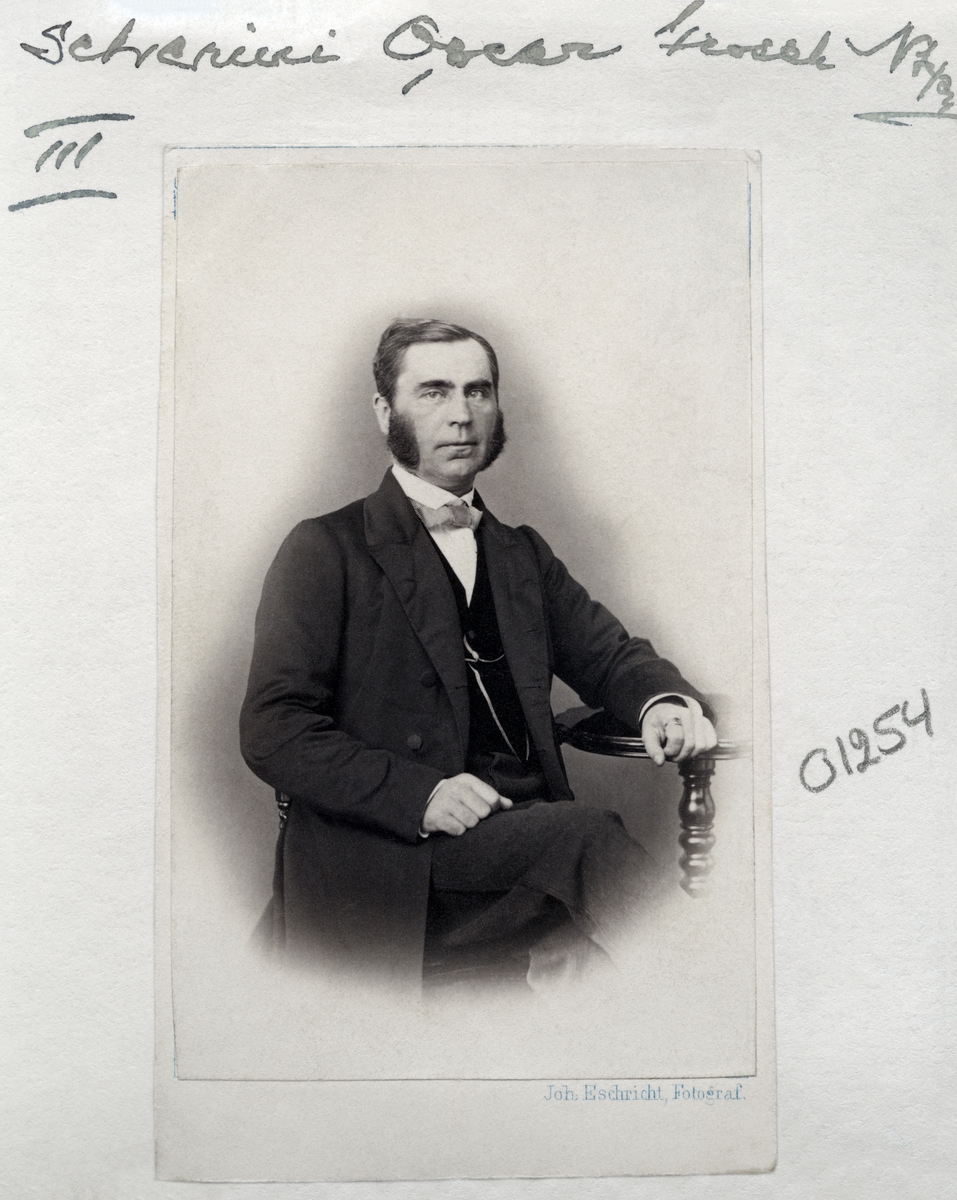Porträtt av grosshandlare Oscar Scherini. Född i Vånga socken den 9 april 1824 som son till kyrkoherden Per Scherini och Anna Lovisa Heller. Grundade kolonialvaruaffären Scherini & Co i Norrköping år 1849 där bröderna Alfred och Josef senare blev delägare. Han förblev ogift och avled den 4 februari 1905.