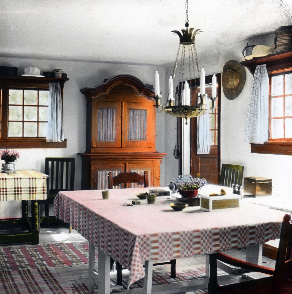 Interiör från arkitekten Magnus Tryséns sommarhus på Kvädölandet i Gryts skärgård. Bild från omkring förra sekelskiftet med unik och rimligtvis korrekt färgåtergivning. Övertygelsen kommer av att koloreringen är utförd av husets ägare.