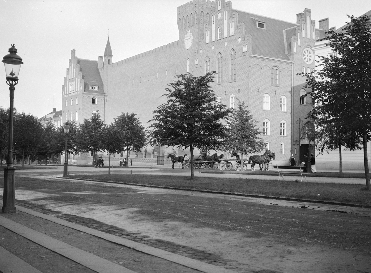 Frimurarehotellet från Vasavägen i Linköping. Fotoåret 1913 var den pampiga byggnaden nyligen invigd, uppförd efter ritningarna av domkyrkoarkitekten i Lund, Theodor Wåhlin.