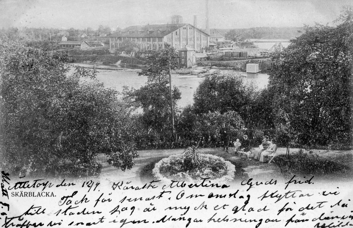 Brevkort med vy från Ribbingshovs herrgård mot Skärblacka bruk.