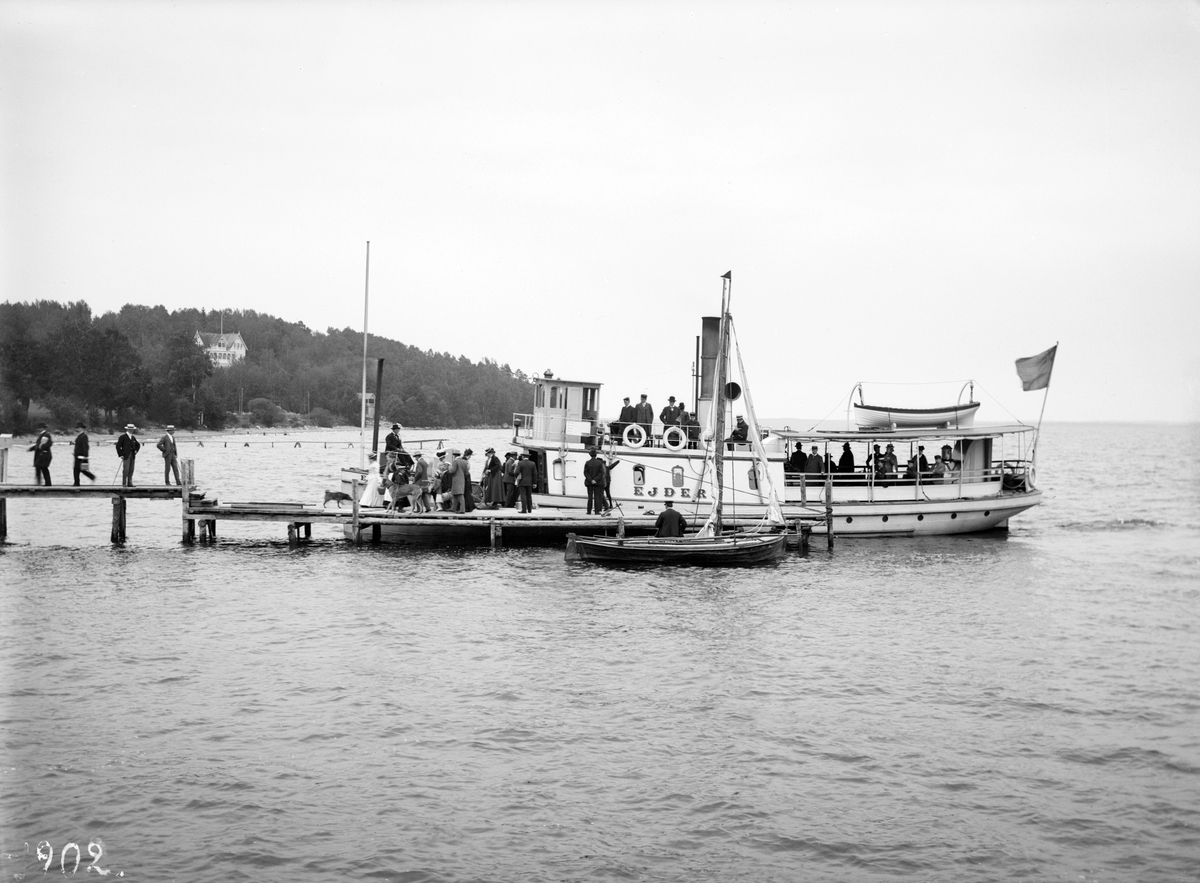 S/S Ejdern har lagt till vid bryggan i Sandvik en sommardag 1902. Vid tiden hade sommarvillor börjat uppföras på orten. Fabrikörer, handlare och andra linköpingsbor med ekonomiska möjligheter önskade ett sommarliv för sin familj och vänner. Färden mellan staden och Sandvik gick helst båtledes och efterhand skapades ekonomi för passagerartrafik.