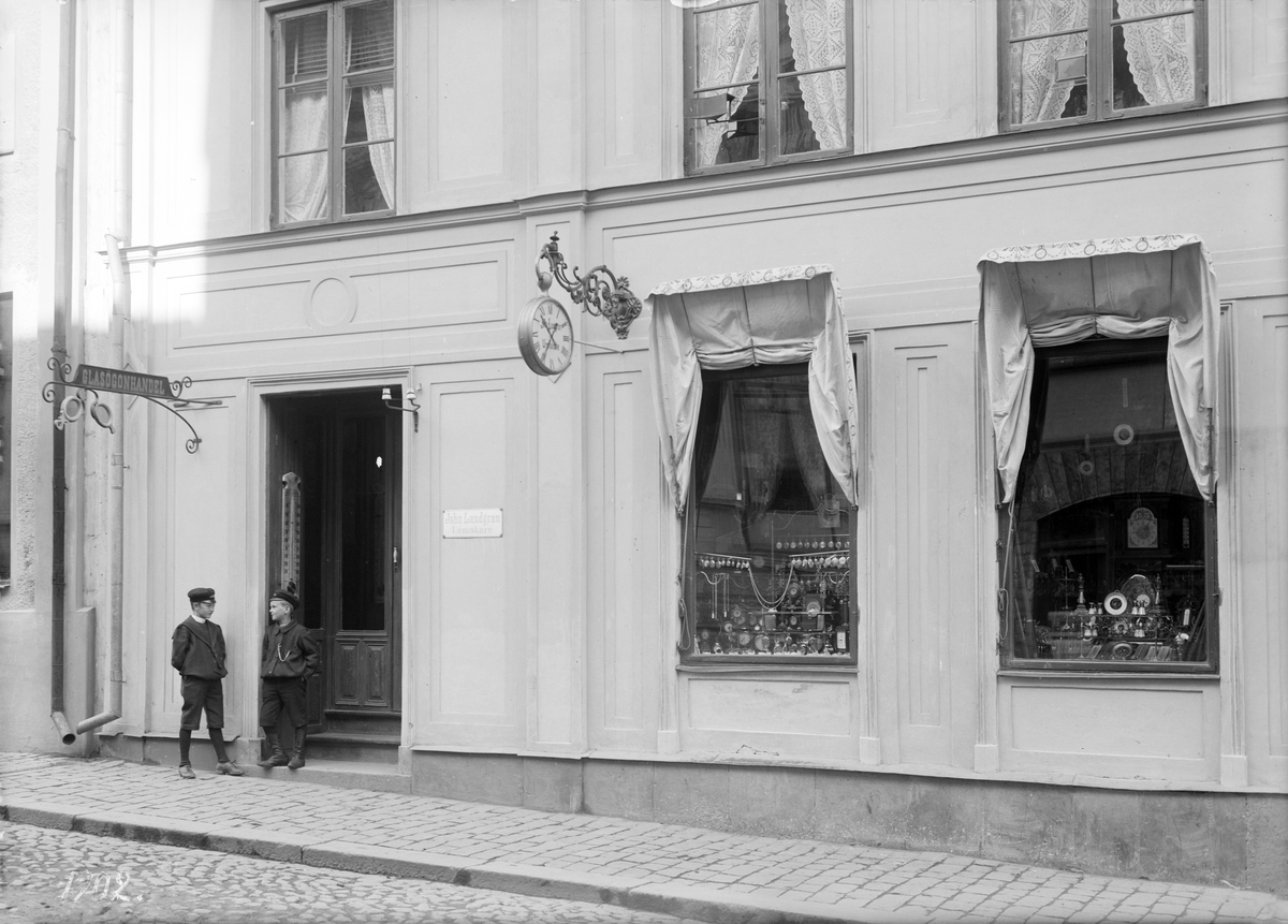 Ett par gossar i samspråk på trappan till John Landgrens urmakeri i Linköping. Pojken närmast dörren ståtar trots sin ringa ålder med ett eget ur. Månne en av makarnas Landgrens söner.