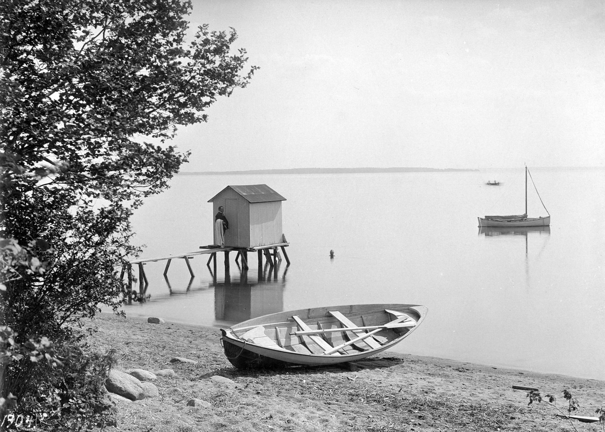 Stillhet i ett allt som oftast livligt Roxenbaden. Utmed sjön Roxen norra strand började under det sena 1800-talet välbeställda linköpingsbor att uppföra sommarvillor för sina familjer. Färden mellan staden och deras sommarvisten gick helst båtledes och efterhand skapades ekonomi för passagerartrafik. För mer privat bruk anlades enklare spänger ut över det långgrunda vattenbrynet, här kompletterat med en badhytt.