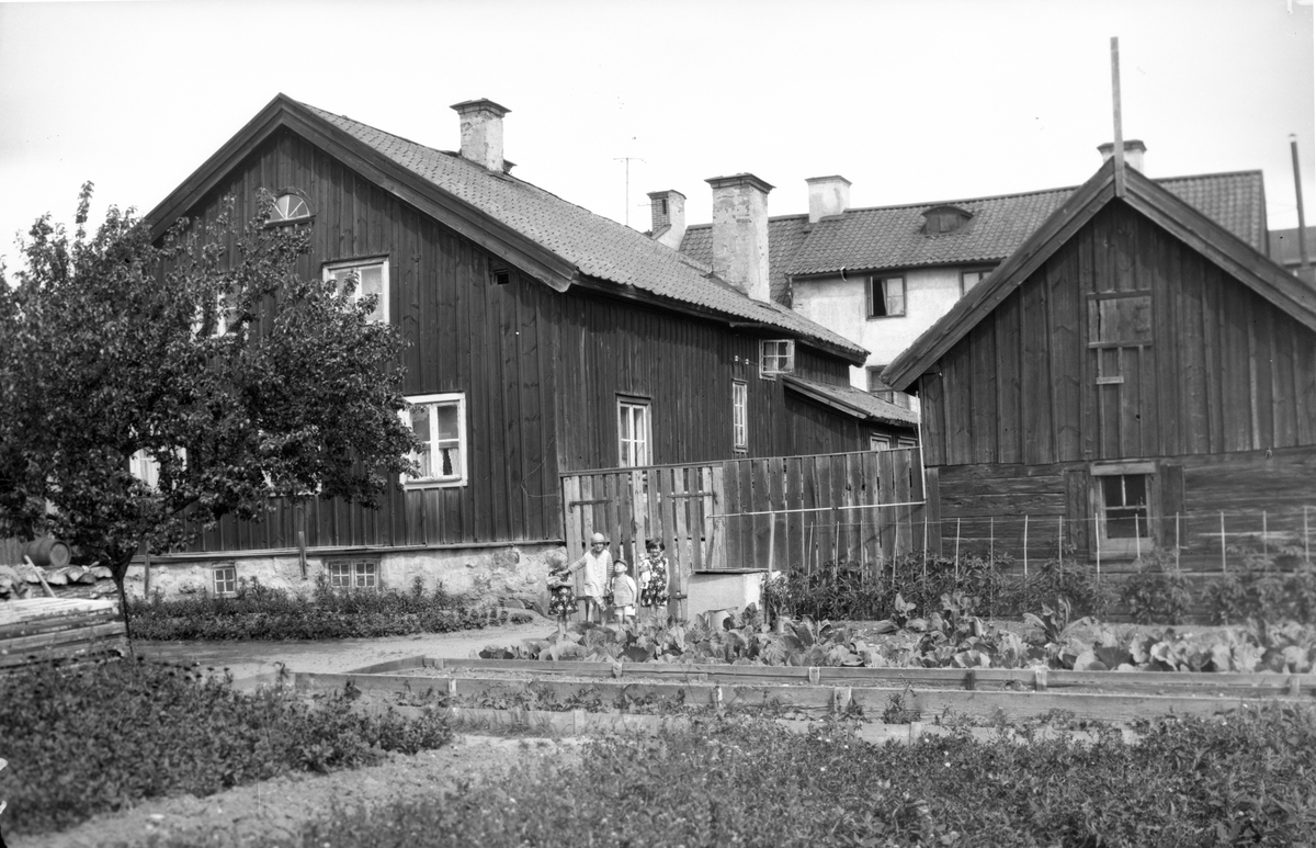 Motiv från Hunnebergsgatan 14 i Linköping. Bilden visar delar av gårdsbebyggelsen. I bakgrunden skymtar gatuhuset. Vy från sydväst.
