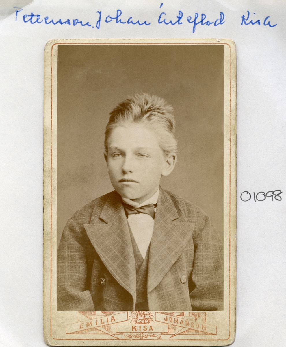 Barnporträtt av Johan Pettersson. Född 1865 i Tidersrum och son till kyrkovärden Peter Johan Nilsson och Matilda Josefina Andersdotter.