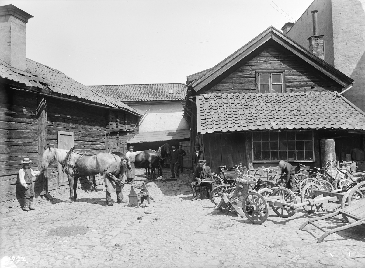 Gårdsinteriör från Stenhusgården, Storgatan 56 i Linköping. På gården drev vid tiden smeden Carl Johan Hall sin verksamhet. Här skoddes hästar och lagades vagnar, den nya tiden representeras av att även cyklar reparerades.