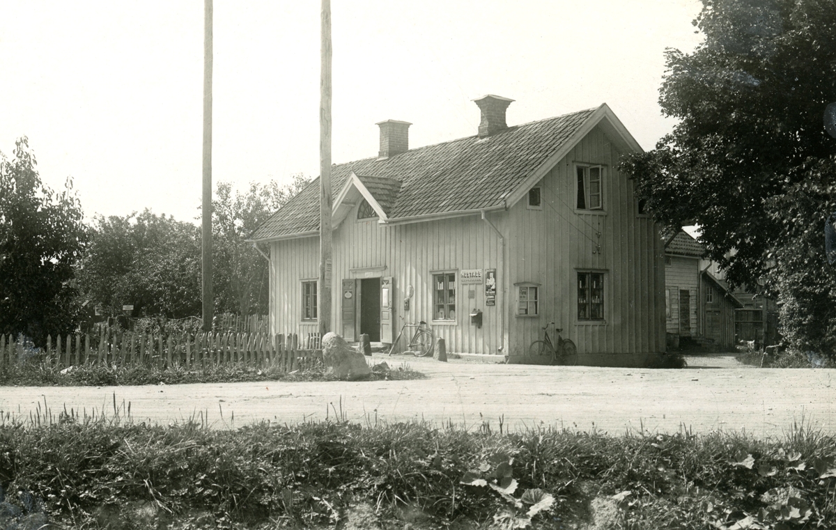 Arvid Andrées handelsbod i Öjebro omkring 1925. Vid husknuten anas annonsering för några av tidens storsäljare, margarin från Mustads fabrik i Mölndal samt tvättmedel och krämer från tekniska fabriken Helios i Sundbyberg.