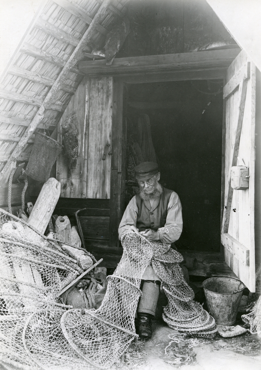 Fiskaren Anders Peter Andersson på Arkö i Östergötlands skärgård. Här lagar han ålhommor vid sin sjöbod. Anders Peter föddes i Å socken 1843. Han var ägare och brukare av gården Ekhult på Arkö. Gift 1873 med Maria Sofie Grentzelius. Makarna fick tre barn mellan åren 1873-76. Änkling 1884. Omgift 1888 med Johanna Christina Jacobsdotter. Död på Arkö 1923. Fotografiet är odaterat.
