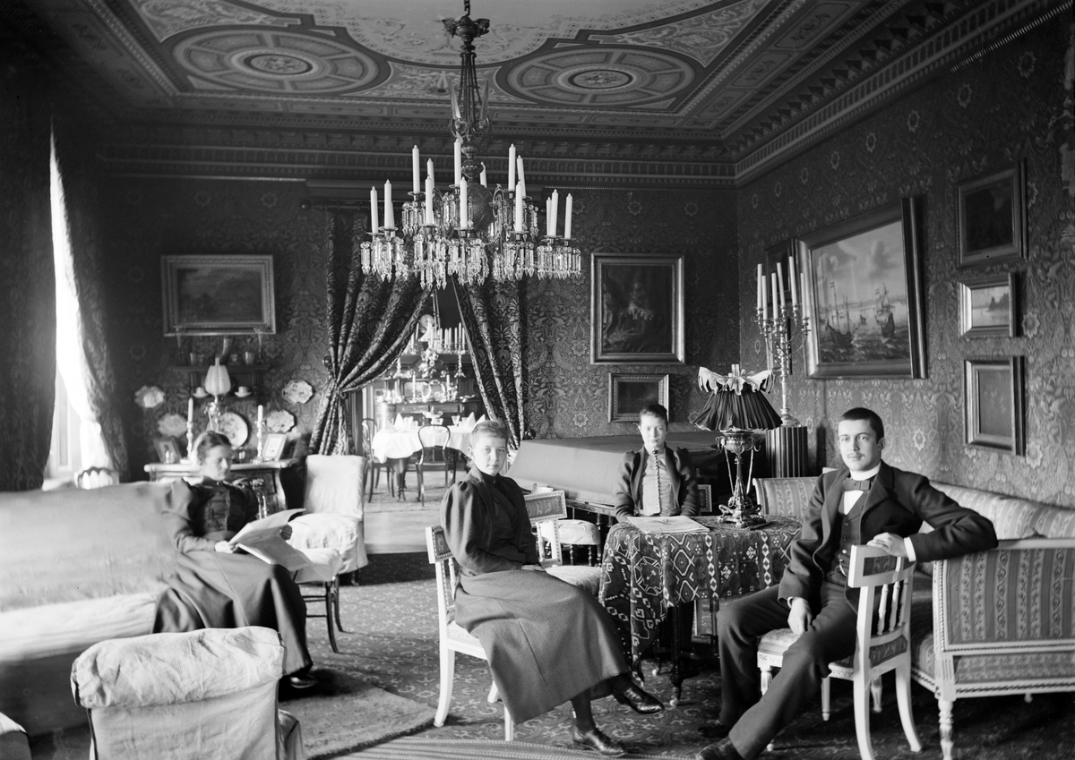 Familjen Lovéns tillvaro i hemmet vid Repslagaregatan i Linköping. Bilden togs 1893 eller möjligtvis året därpå och bakom kameran stod den fotointresserade husfadern överste Fritz Lovén. Läsande i soffan sitter hustrun Lovisa och vid bordet sannolikt barnen Jeanne och Fredrik bredvid en icke namngiven kvinna.