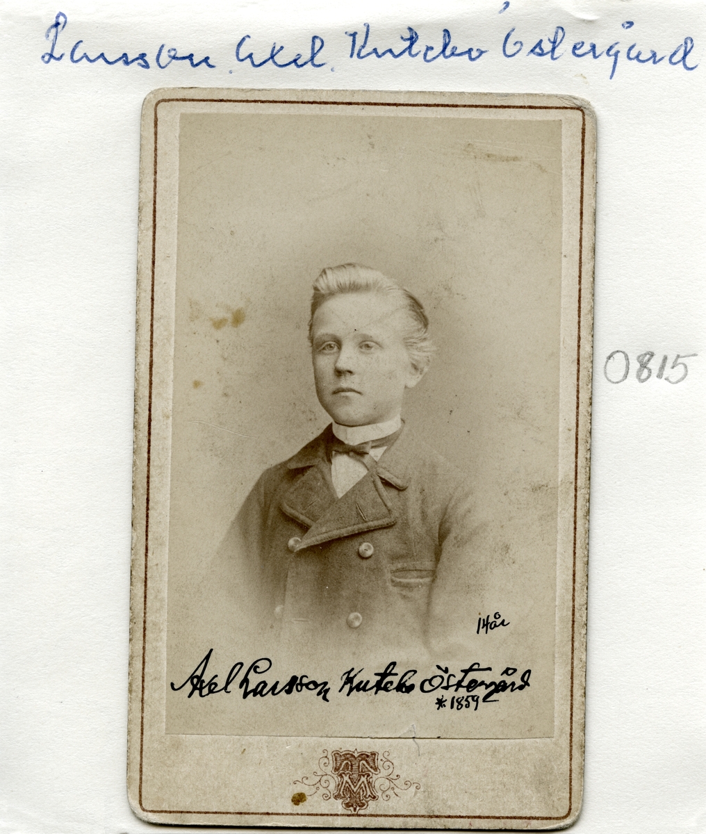 Porträtt av gossen Axel Larsson vid 14 års ålder. Född och uppvuxen i Kottebo (Kutebo) i Ulrika socken som son till Lars Magnus Olofsson och Margaretha Larsdotter.