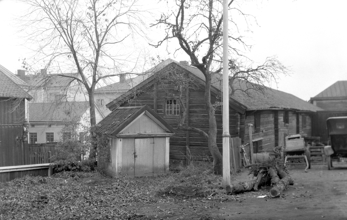 Gårdsinteriör från Hallska gården med adressen Apotekaregatan 17 i Linköping. Namngiven efter sentida ägaren, smidemästaren Carl Johan Hall. Gården även benämnd som Barkmanska gården efter jägmästare Carl Gustaf Barkman, som år 1713 lät uppföra mangårdens första våning. Bilden visar gårdens lusthus och stall.