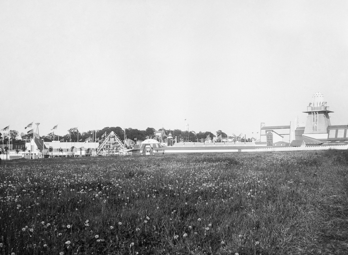 Vy mot utställningsområdet för Konst- och industriutställningen i Norrköping 1906. De flesta byggnader var ritade av arkitekt Carl Bergsten. Den största, indistrihallen, hade plats för närmare 630 utställare.