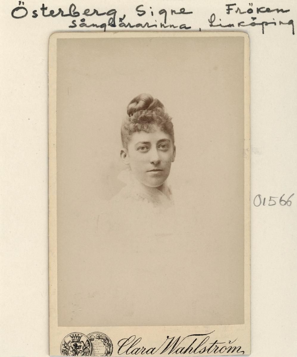 Vinjetterat porträtt av Signe Österberg. Vid tiden för bilden var hon i 30-årsåldern och bodde ännu hemma och skulle så göra länge än. Fadern hette Frans Wilhelm Österberg och var en framgångsrik handlare i Linköping med butik invid Stora torget. Modern hette Ida Brogren och var bördig från Gammalkil. Efter föräldrarnas bortgång 1914 respektive 1917 bodde Signe kvar i föräldrahemmet och försörjde sig som sånglärare. Hon gick bort som ogift 1950.