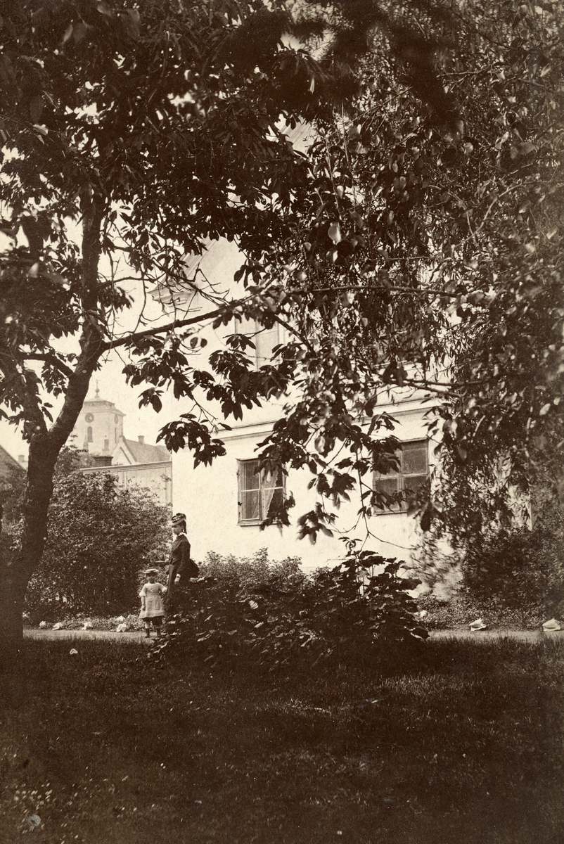 Ett fotografi från försommaren 1875 där endast bilden består av miljön. Att det rör sig om Linköping råder inga tvivel. I bakgrunden skymtar tornet till stiftets domkyrka -ännu en tid med sitt Hårlemanska torn- och gaveln till stadens läroverk. Bostadshuset följer en äldre gatusträckning och vi hamnar i stadens gamla lasarettsområde och där sjukhusets läkarbostad. Huset står kvar in i vår tid men genomgick en omfattande ombyggnad omkring förra sekelskiftet. Efter dåvarande ägare Bengt Ruuth kallar vi huset Ruuthska villan. Backar vi åter till tiden för bildens tillkomst disponerades bildens hus av lasarettsläkaren Ludvig Åman med familj. Den unga kvinna och barnet som strosar genom trädgården torde vara makarnas äldsta och yngsta döttrar, Ellen och Emilia.