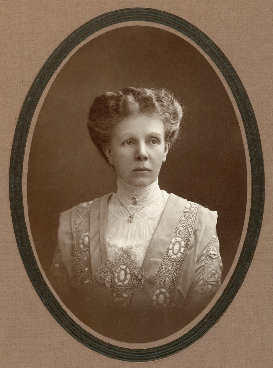 Porträtt av Emelie Piper. Född på Löfstad slott 1857 som dotter till godsets ägare, makarna Charles Emil och Sophie Piper. Efter moderns tidiga bortgång valde Emelie att som ogift vårda sin åldrande far och bistå honom i skötseln av godset. Fadern gick bort 1902 och Löfstad ärvdes av Emelie och hennes äldre syster Sophie. Emelie löste emellertid ut systern och blev ensam ägare till sin död 1926. Hon kunde därför följa sin vilja att testamentera slottet, parken och ägorna till Riddarhuset, medan inventarierna tillföll Östergötlands fornminnes- och museiförening (nuvarande Östergötlands museum).