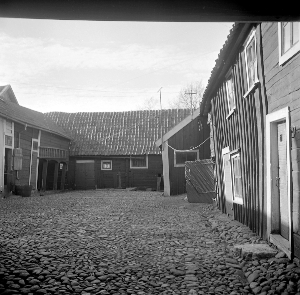 Gårdsinteriör från den sista stadsbondegården i Skänninge, belägen i hörnet av Helgonagatan och Gullringsgatan. Gården revs i slutet av 1950-talet. Här dokumenterad av Östergötlands museum 1938.