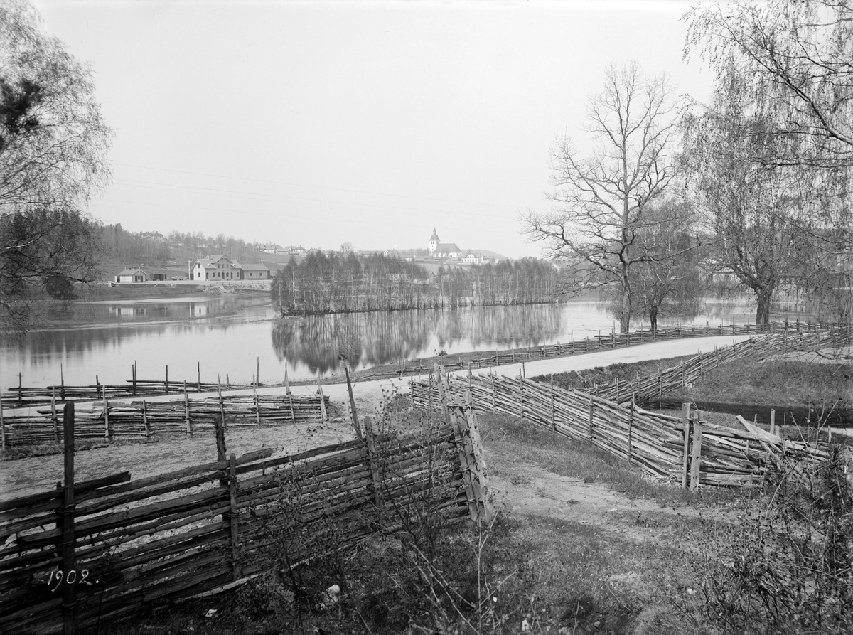 Vy över den översvämmade Kisaån mot Kisa. Året är 1902 och till vänster i bild ses ortens järnvägsstation som vid tiden var precis färdigställd för att tjäna den samma år invigda Östra centralbanan.