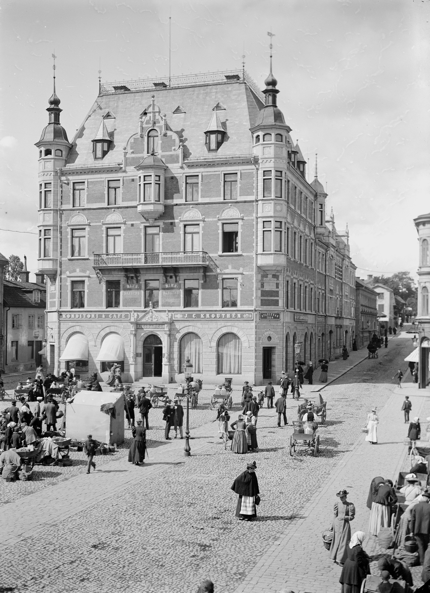 Jonn O Nilsons hus i Linköping 1898. Byggnaden uppfördes 1892-94 efter ritningar av arkitektfirman Fritz Ulrich & Eduard Hallquisth. Byggnadens markplan förbereddes för butiker. På bilden ses Herdina Lindbergs konditori och J C Krouthéns manufakturaffär. Andra våningen inreddes för kontor, bland andra för stadens Post och Telegrafstyrelse. I de övre våningarna skapades en ståndsmässig bostad åt byggherren. I bildens förgrund ses torghandel på Stora torget.