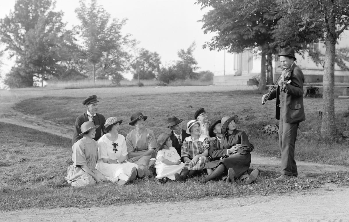 Ett sällskap har slagit sig ned i gröngräset på kyrkbacken framför Svinhult kyrka. För underhållningen står spelmannen Oskar Johansson, Oskar i Glappa kallad efter sitt boställe Klockmåla som även kallades Glappa. Tiden är någon sommardag på 1920-talet.