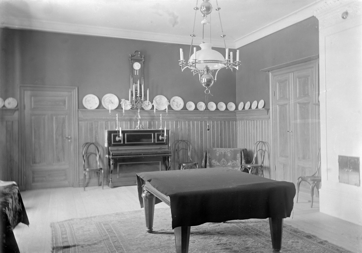 Interiör från Brändströmska gården i Linköping, uppkallad efter överste Edvard Brändström som under några år kring förra sekelskiftet bodde här med sin familj. Just detta rum var som synes sparsamt möblerat och gav svängrum runt det biljardbord som vi får förmoda döljer sig under filten. Bilden är inte exakt daterad.