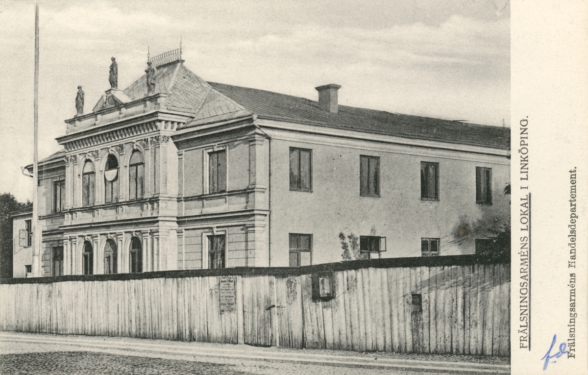 Brevkort med odaterat motiv mot Frälsningsarméns möteslokal i Linköping. Byggnaden uppfördes i början av 1880-talet som teater- och cirkusbyggnad i den så kallade Wernerska trädgården, som under 1800-talets senare hälft utgjort platsen för ett av stadens största nöjesetablissemang. För ritningarna i italiensk renässansstil stod byggmästare Oskar Göransson. Tiden som varitéteater kom att bli kort. Efter att trädgårdens ägare och nöjesentreprenör, Anders Peter "Bonn på Druvan" Andersson gått bort 1886 gick luften ur rörelsen och teatern kom redan från dennes dödsår att hyras ut till Frälsningsarmén.