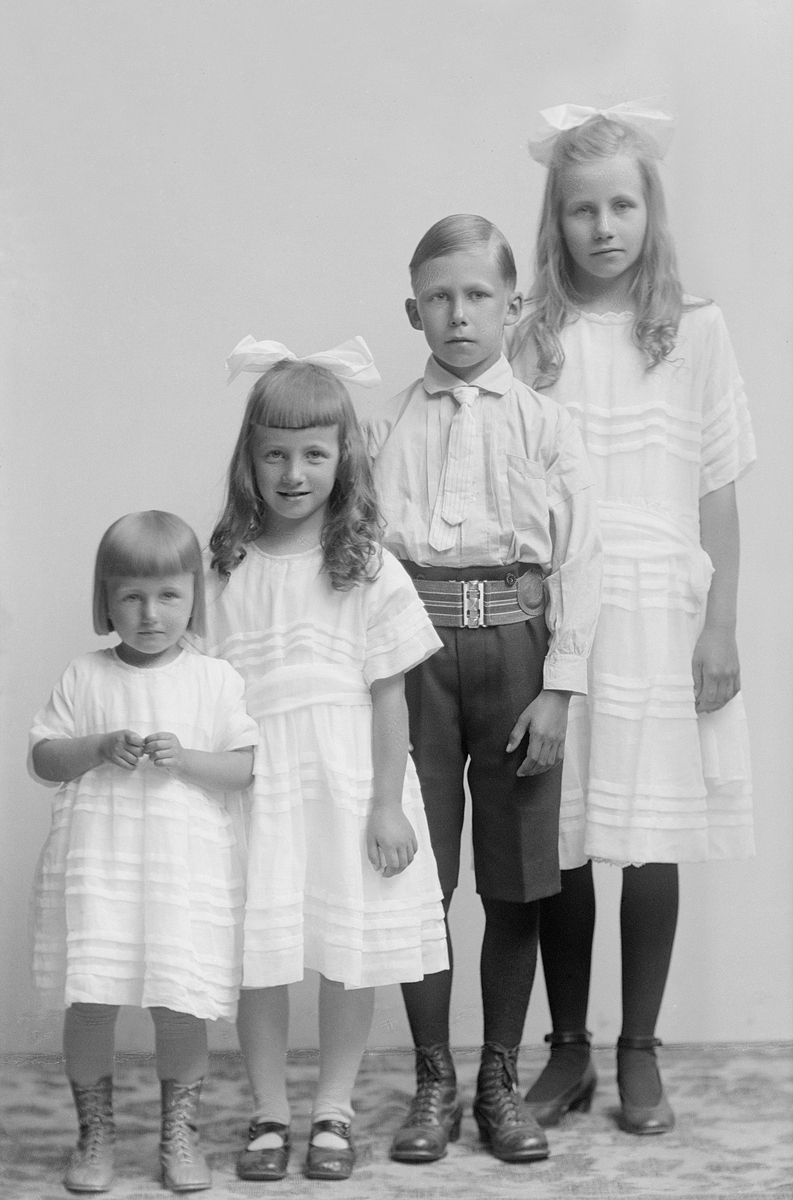 Ernst och Ester Vilhelmina Björkmans fyra förstfödda barn i betonad ålderstrappa. Barnens tilltalsnamn har inte kunnat styrkas för uppgiften så med fullständiga förnamn ser vi från vänster yngsta dotter Maj-Lis Ingegärd följd av Anna Britta Vilhelmina, Karl Fridolf Göte och Stina Margareta. Bilden är tagen något år in på 1920-talet. Familjen var då bosatt i Örtomta där fadern var trädgårdsmästare vid Ekenäs slott.
