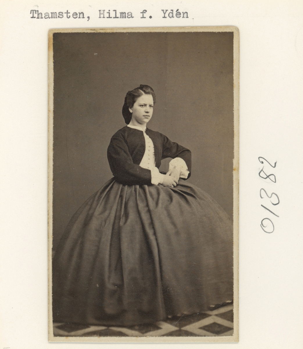 Ungdomsporträtt av Hilma Ydén. Född i Skänninge 1845 som dotter till läraren och organisten Nils Petter Ydén och makan Christina Wilhelmina Carlheim. I vuxen ålder flyttade Hilma till Kisa och vidare till Norrtälje tills hon år 1874 slog sig ned i Motala. Där gifte hon sig efter några år med tobakshandlaren Johan Oskar Waldemar Thamsten. Deras äktenskap blev barnlöst och nådde sin ände när maken avled 1918. Hilma levde vidare som änka i närmare tio år.