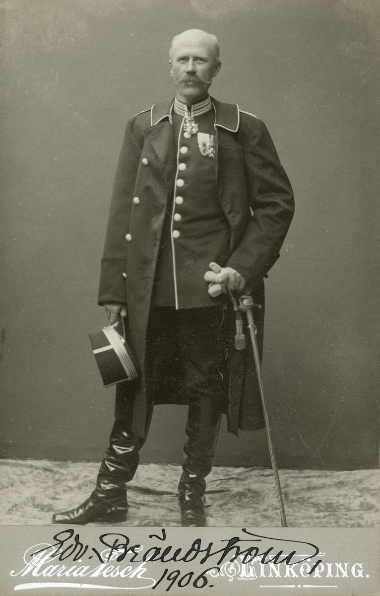 Överste Edvard Brändström i linköpingsfotografen Maria Teschs ateljé. Han inflyttade med sin familj till staden 1896. Skälet var hans placering vid Första livgrenadjärregementet. Från 1898 har han varit regementets chef. Nu väntar nytt äventyr för familjen. Inom kort ska Brändström ikläda sig rollen som svensk minister i S:t Petersburg.