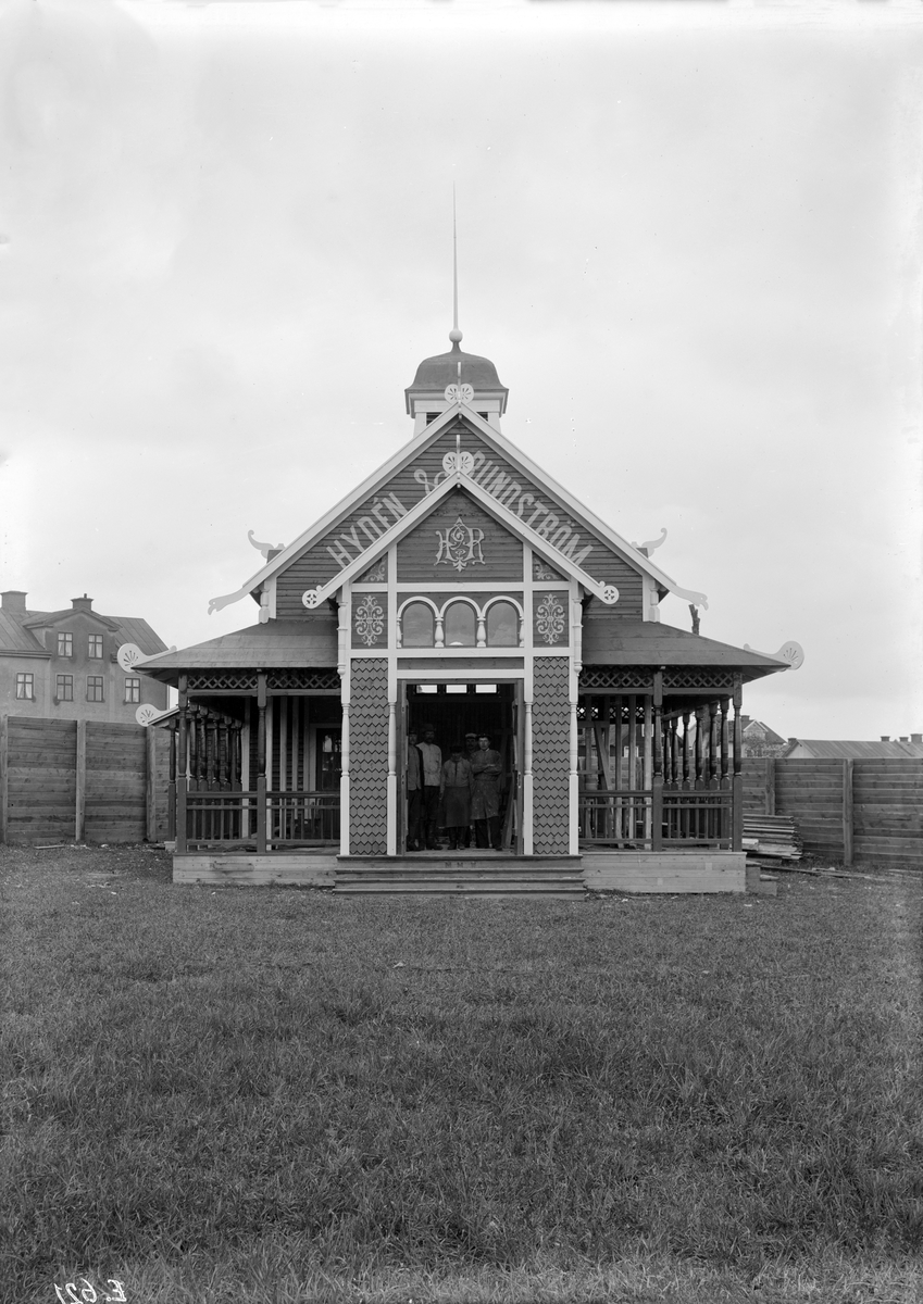 Järn- och redskapsaffären Hydén & Rundströms paviljong vid 1898 års lantbruksmöte i Linköping. Företagets minst sagt påkostade monter kom upplysningsvis att efter utställningen flyttas till Stjärnorp för att tjäna som familjen Hydéns sommarhus.