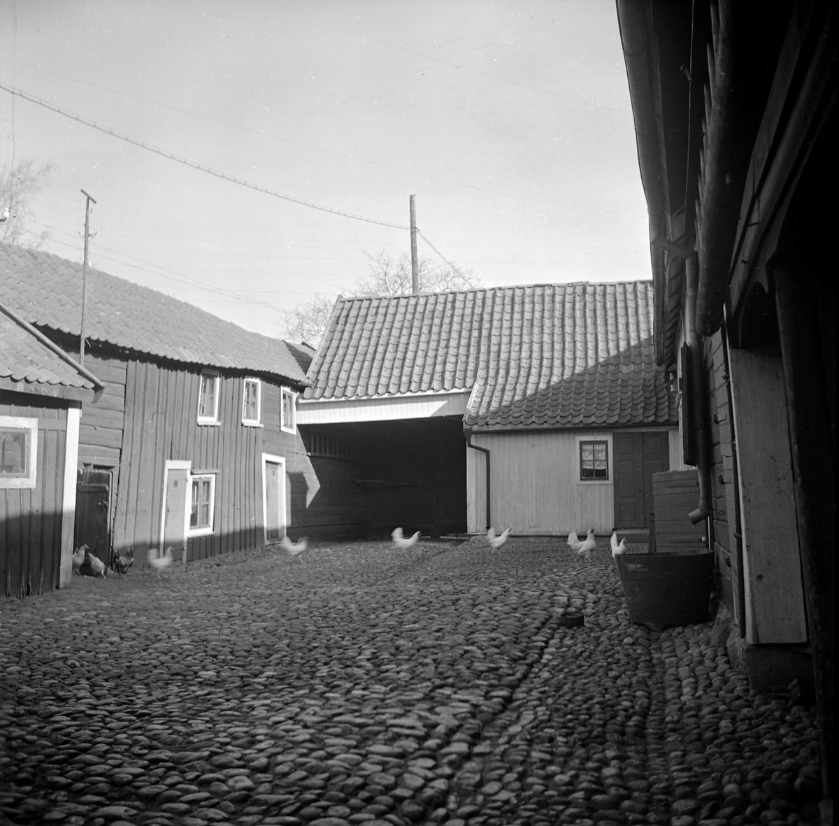 Gårdsinteriör från den sista stadsbondegården i Skänninge, belägen i hörnet av Helgonagatan och Gullringsgatan. Gården revs i slutet av 1950-talet. Här dokumenterad av Östergötlands museum 1938.