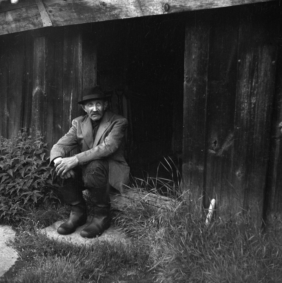 Johan Albin Stein på tröskeln till Österhagen i Bankekind. År 1920 hade han både gift sig och blivit ägare till det lilla hemmanet. Hustrun hette Maria Lovisa Gustafsson och hade med sig tre barn in i äktenskapet. Nu är året 1950 och Johan Albin har varit änkling sedan 1939.