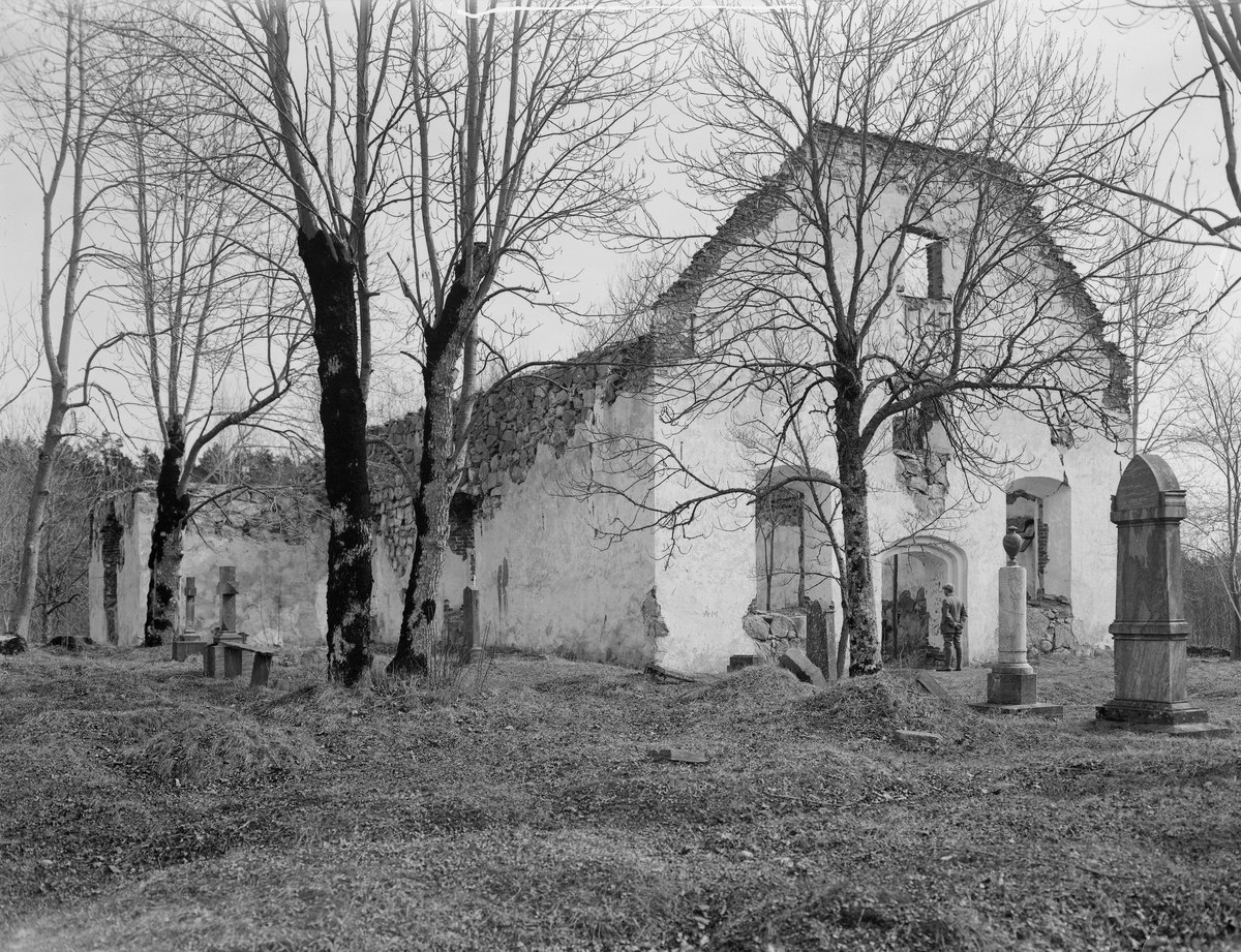 Ödekyrkan i Krokek som den togs sig ut 1923. I sin glans dagar ersatte kyrkobyggnaden ett kapell från 1500-talet. Uppförd 1747 efter ritningar av självaste biskopen Andreas Rhyzelius. Byggnadsmaterialet tog man till största delen från det gamla nedlagda klostret intill. Söndagen den 28 april 1889 skulle kyrkan, som brukligt vid kall väderlek, värmas upp inför stundande högmässa. Just denna gång antände olyckligtvis gnistor från kaminen kyrktaket. En våldsam brand bröt ut och byggnaden förstördes bortom möjlig återuppbyggnad. Länge stod emellertid kyrkan som ruin relativt intakt. I omgångar har ruinen monterats ned och idag består den av meterhöga grundmurar.