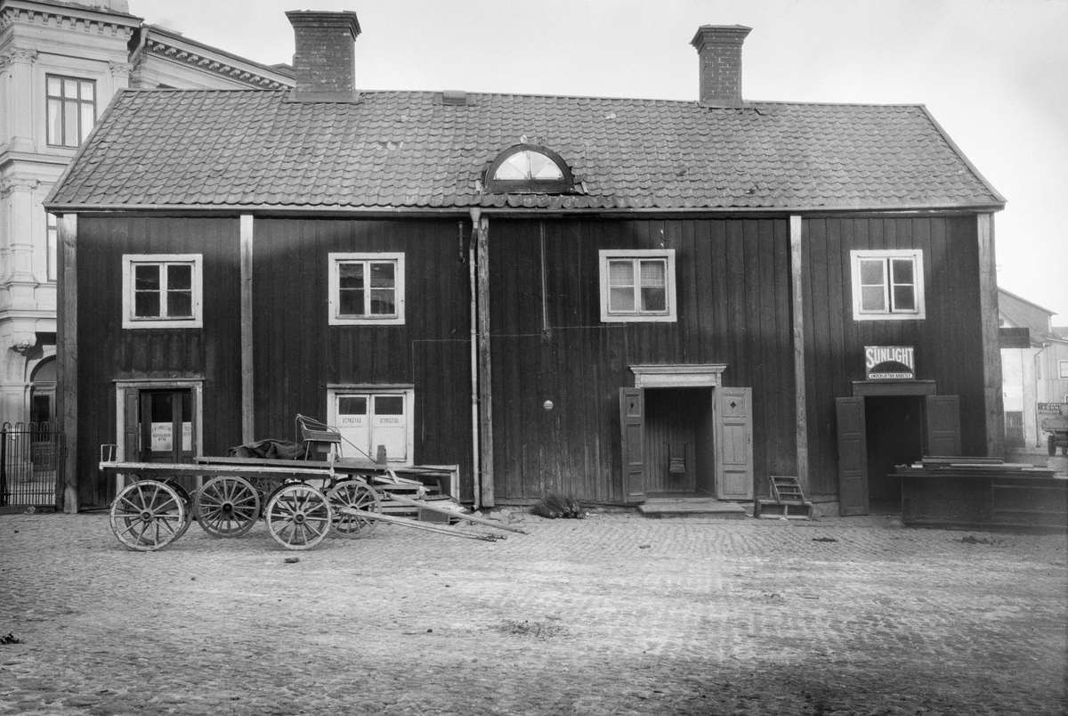 Den gamla trähuslängan utmed Trädgårdstorget i Linköping töms inför rivning 1926. Här gårdssidan mot det nordligast belägna huset invid korsningen Nygatan-Tanneforsgatan. Till vänster skymtar fastigheten Nygatan 25, som ännu består men mot torget med en förenklad fasad. På platsen för trähusen kom det så kallade Delfinpalatset att uppföras och i sammanhanget vidgades Trädgårdstorget till sin nuvarande rektangulära form.