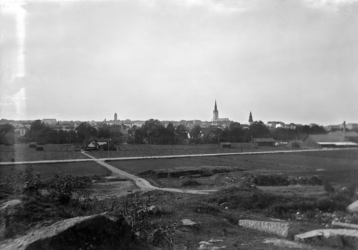 Trots brister i utförandet och tidens tand bär denna sällan sedda vy mot Linköping stora värden. Utblick över det ännu närmast obebyggda delarna av Tannefors mot staden i nordvästlig riktning. Odaterad bild som preciserats till 1913.