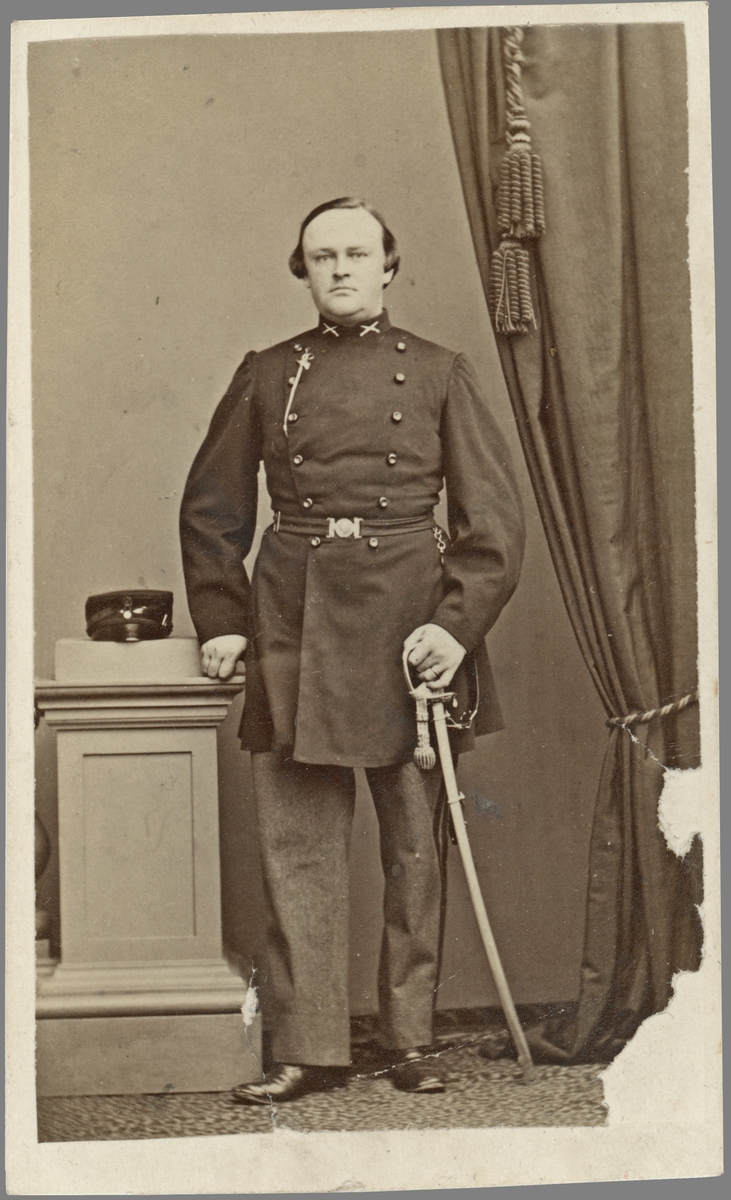 Porträtt av köpman Eduard Andersson iförd Linköpings frivilliga skarpskytteförenings uniform. Född i Stora Malm kom han till Linköping 1847, ännu inte fyllda 14 år. Han tog tjänst som bodbetjänt hos handlare Möller. Genom flit och strävan avancerade han till bokhållare och i slutet av 1850-talet lyckades han överta rörelsen. Med tiden kom Eduard Anderssons Garn- och Vävnadshandel att bli mycket framgångsrik. Handeln drevs från ett vackert hus på nuvarande adressen Storgatan 52. År 1860 gifte han sig med Anna Johanna Augusta Kullgren.