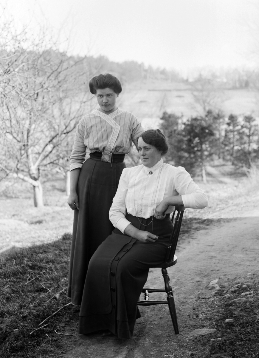 Två väl skrudade kvinnor poserar för fotograf Emil Durling vid Strömmen i Sankt Anna. Kvinnan till vänster är Magda Svensson, vidare gift med handelsbiträdet Mats Olivio Axelsson. Kvinnan på stolen är Hilma Andersson, gift med fiskaren Einar Andersson.
