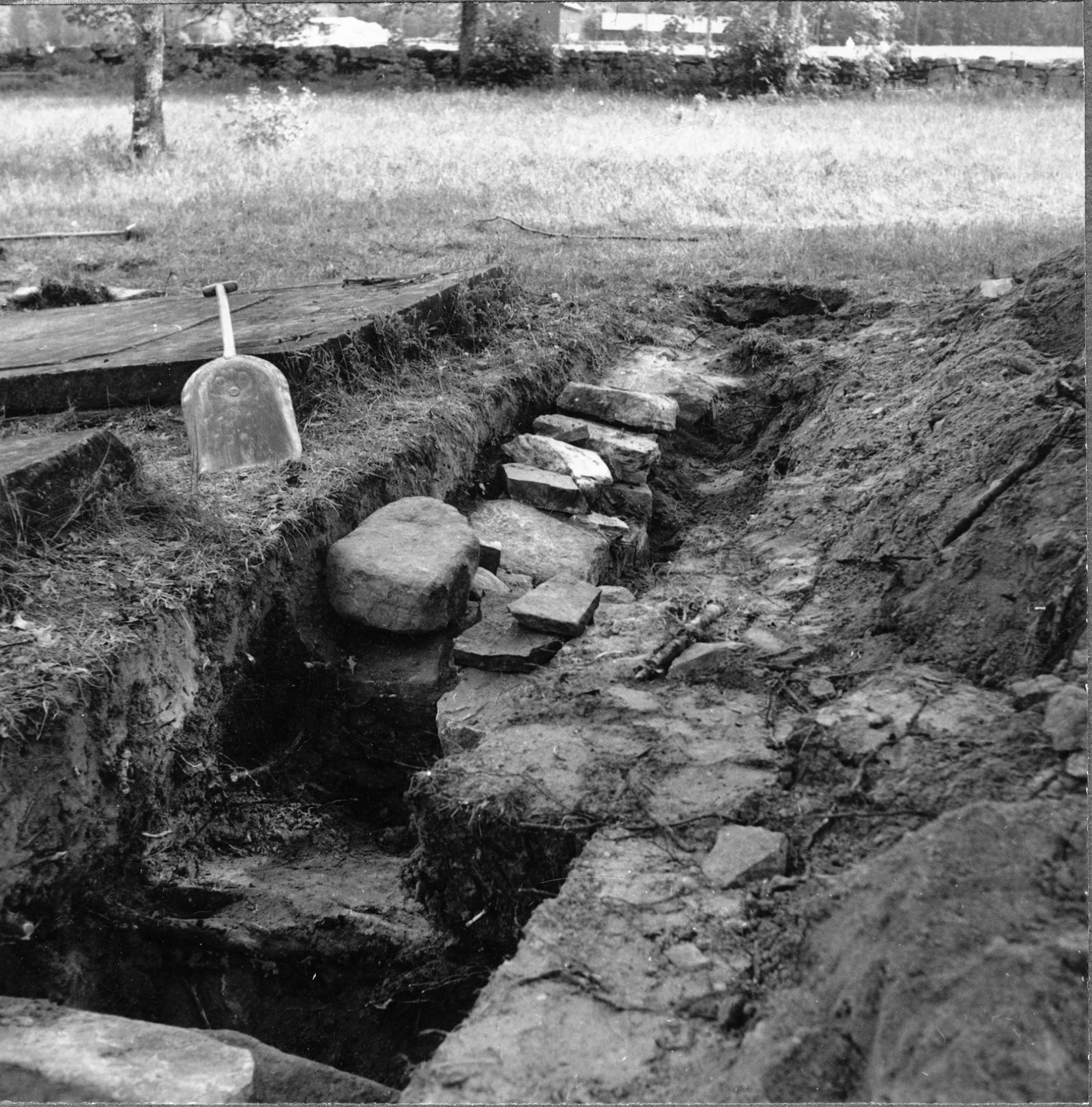 Utgrävning, schakt, i djupare delen plats för myntfynd vid M I.
