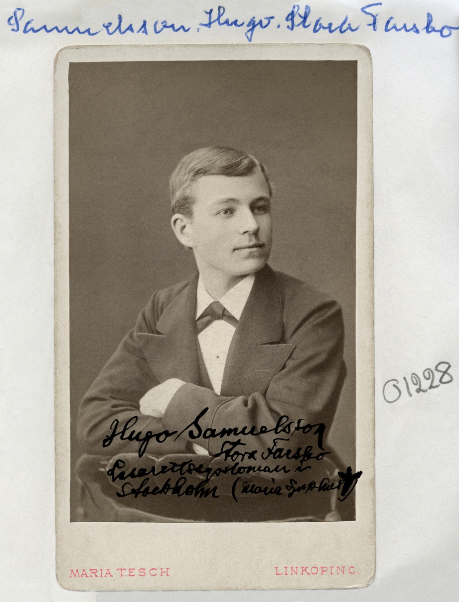 Enligt uppgift porträtt av Hugo Samuelsson. Född 1861 i Stora Farsbo, Ulrika socken som son till Samuel Israelsson och Ingrid Carolina Carlberg. I vuxen ålder flyttade han våren 1886 från familjehemmet till Stockholm för en tjänst som lasarettssyssloman vid Maria sjukhus. Arbetet utvecklades vidare till den både obestämda som uppenbara titeln gaskontrollör. Hans anställning blir emellertid tydlig när han efter några år i Stockholm blivit polis. Han avled som ogift den 14 februari 1916.