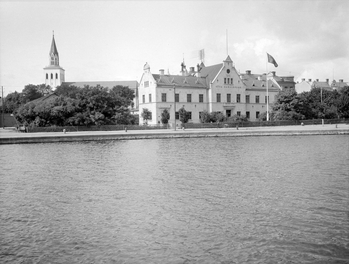 Vy mot två dominerande byggnader i Motala. Göta kanalbolagets kontor och ortens kyrka. 1900-talets första del.