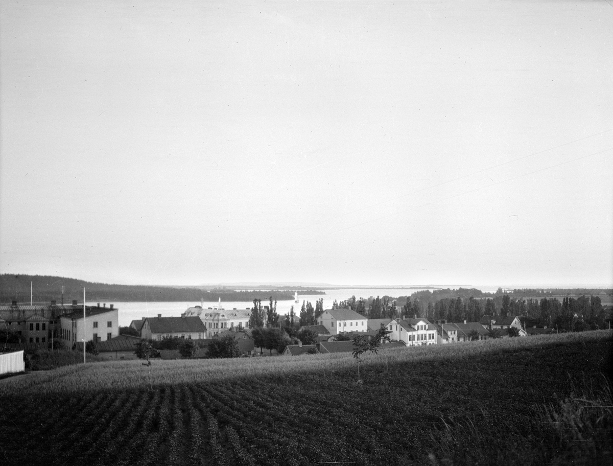 Parti av Motala med husraden utmed Drottninggatan, i stora drag mellan den numera avsnörpta Prästgatan till Repslagaregatan. Odaterad bild från 1900-talets första del.