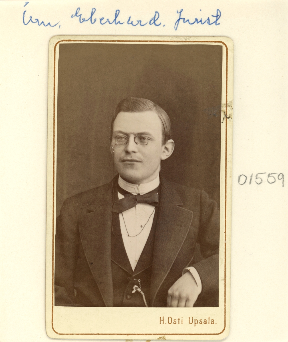 Porträtt av Eberhard Örn. Född 1854 i Stora Tuna församling i Dalarna där fadern vid tiden tjänstgjorde vid Dalaregementet. Med tiden kom fadern att knytas till Första livgrenadjärregementet i Linköping och från 1871 var familjen bosatt i staden. Efter juridiska studier i Uppsala kom Eberhard att från 1888 vara verksam i Stockholm. Hans tid i huvudstaden har för denna beskrivning inte utretts, utan här noteras endast hans död i sviterna av leversvikt på juldagen 1899. Han var då skriven på Funckens gränd invid Kornhamnstorg.