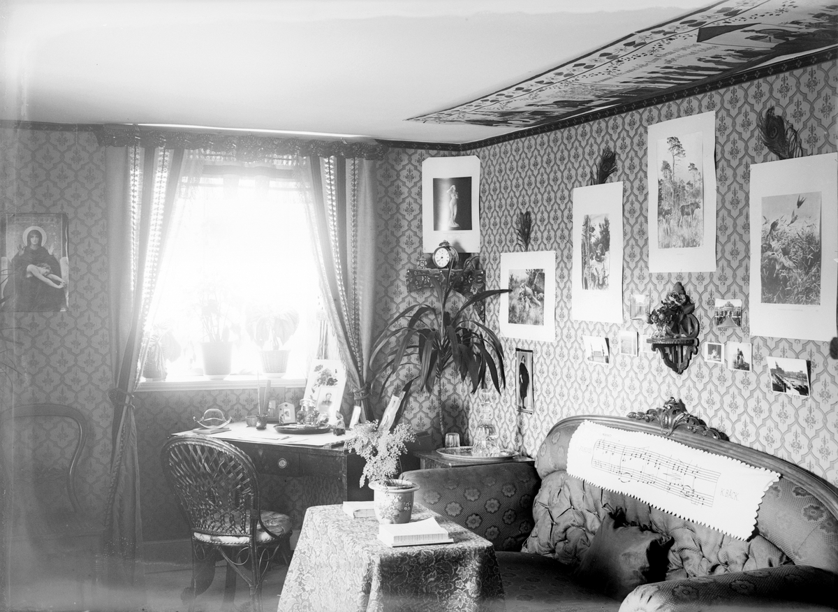 Interiör från Hägerstad slott i Hannäs. Tiden är 1890-talets senare hälft, under den period slottet ägdes av protokollsekreterare Ludvig Bäck och dennes makan Carolina, född Malmström. Den av motljus och av tiden påverkade bilden visar ett av vindsvåningens rum, som med ledning av rummets prägel sannolikt disponerades av den tonsättande sonen Knut Bäck.
