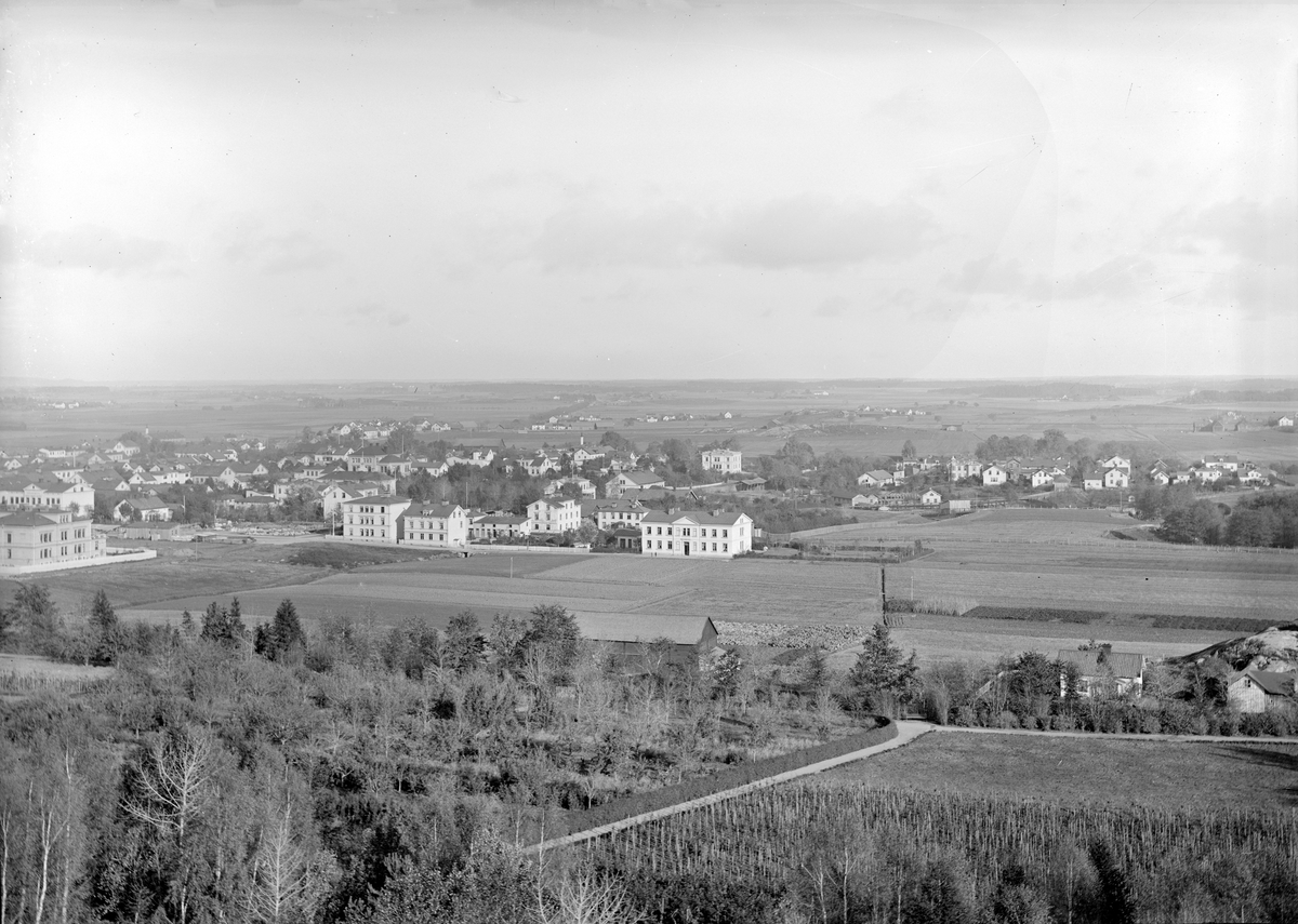 Panoraman över Linköpings stads då södra delar 1893. Stadens utbredning i söder var nu nära nog ansluten till de så kallade Tinnerbäckslyckorna och vidare Hejdegården.