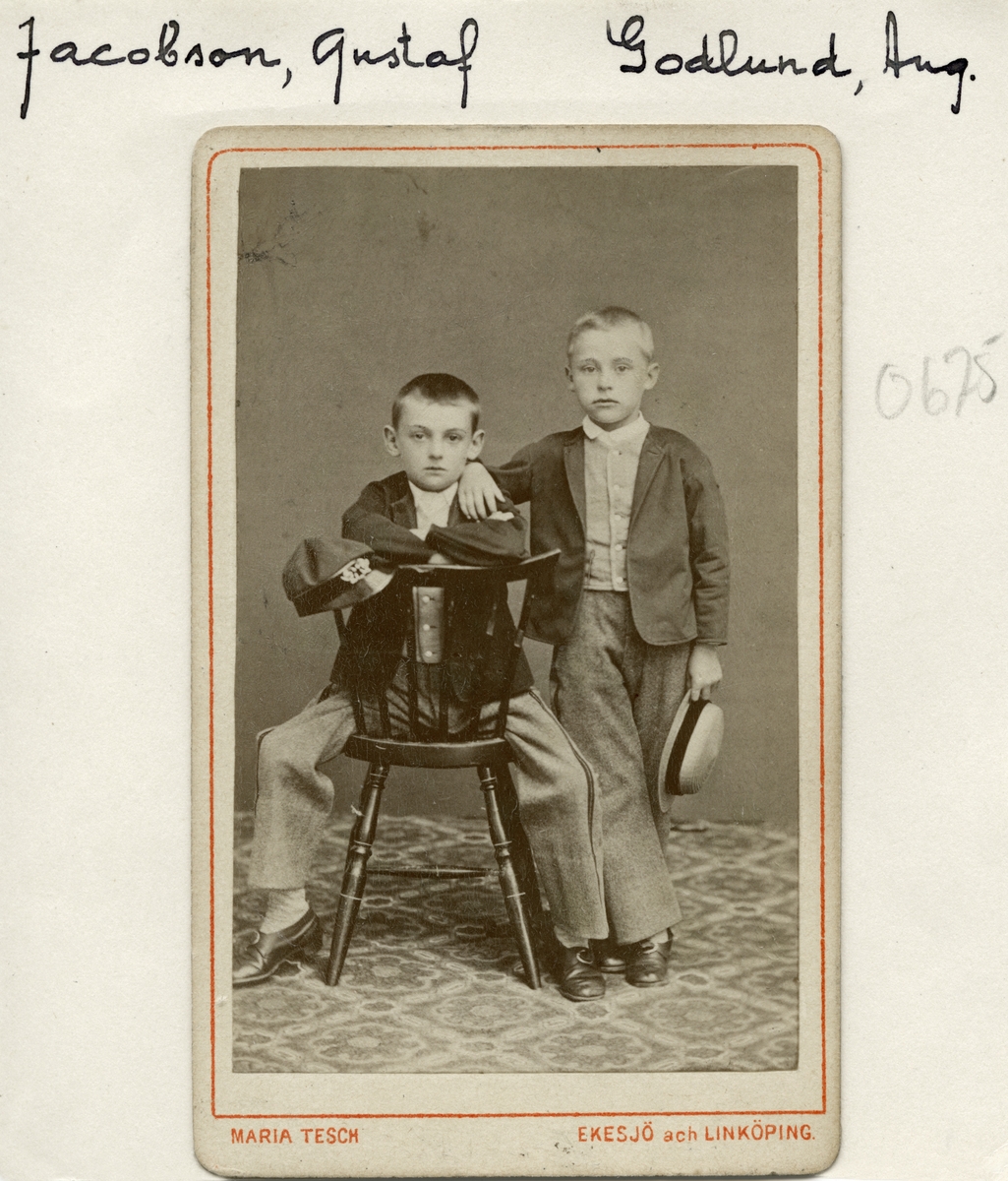 Porträtt av gossarna Gustaf Jacobsson och August Godlund. Son respektive fosterson till köpmannen i Linköping, Carl Jacob Jacobsson och dennes maka Clara Sandberg. Gustaf kom dessvärre att få ett kort liv. Han avled 1875 i tuberkulos och hjärnhinneinflammation dagar före han skulle fylla 13 år. August, som kommit till familjen från Stockholm 1870, flyttade tillbaka dit 1880.